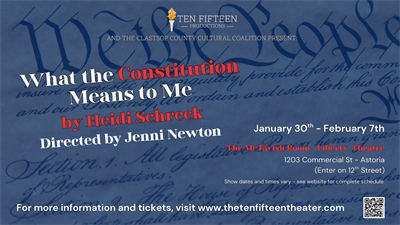 Ten Fifteen Productions’ 2026 Season, America the Beautiful?, will begin later this month with What the Constitution Means to Me. This exploration of the blueprint of our country will help to set the tone of national self examination over the course of the year. Sponsored in part by a grant from the Clatsop County Cultural Coalition, the production dates and venue have been changed from the original announcement due to repairs occurring at the organization’s home in the Odd Fellows Building.